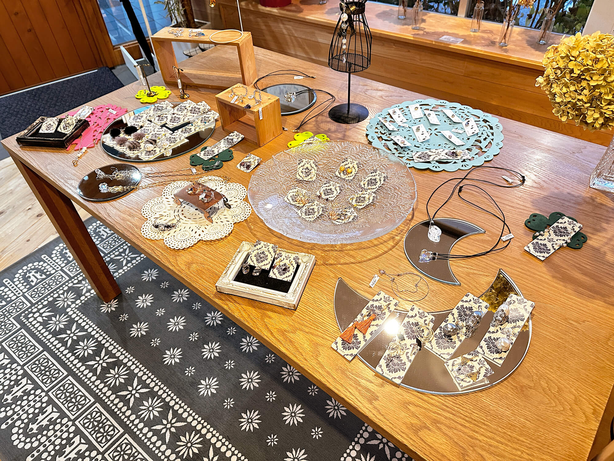イヤリングやペンダントなどをじっくり眺めながら、お気に入りの一点と出会える、心地よい空間となっていました。