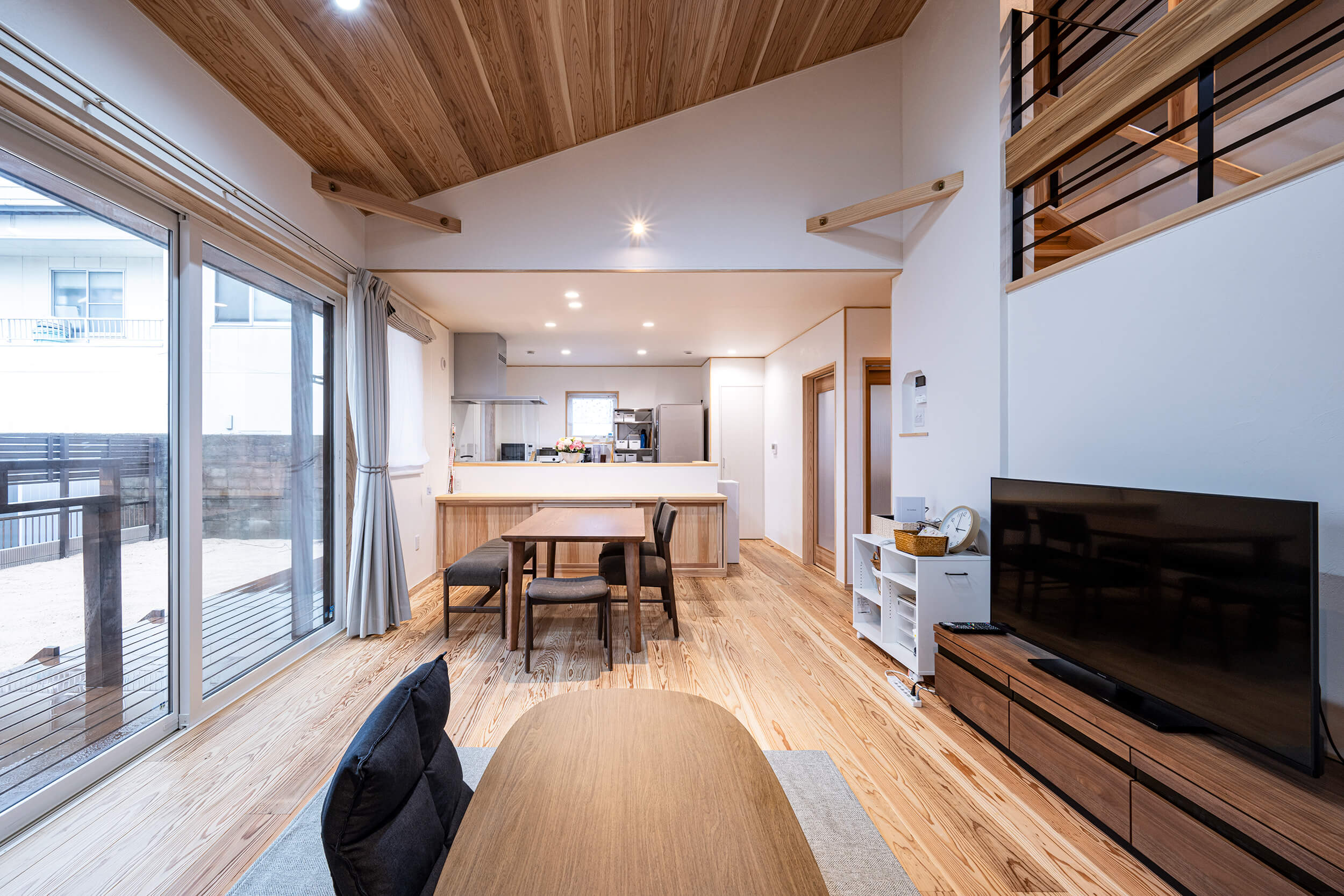 勾配天井と吹き抜けが心地よい、開放感あふれるリビング・ダイニングが印象的なお住まい。