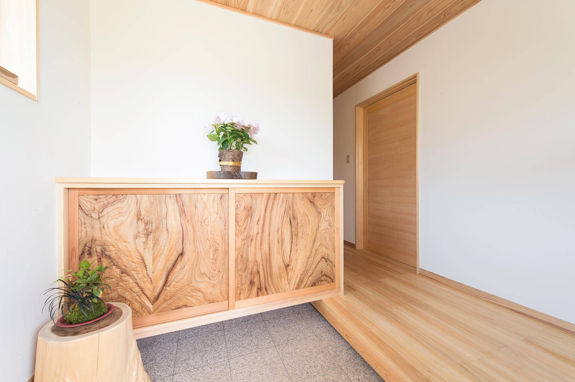 (※地元の製材所より譲り受けた、銘木を使用した玄関収納。)