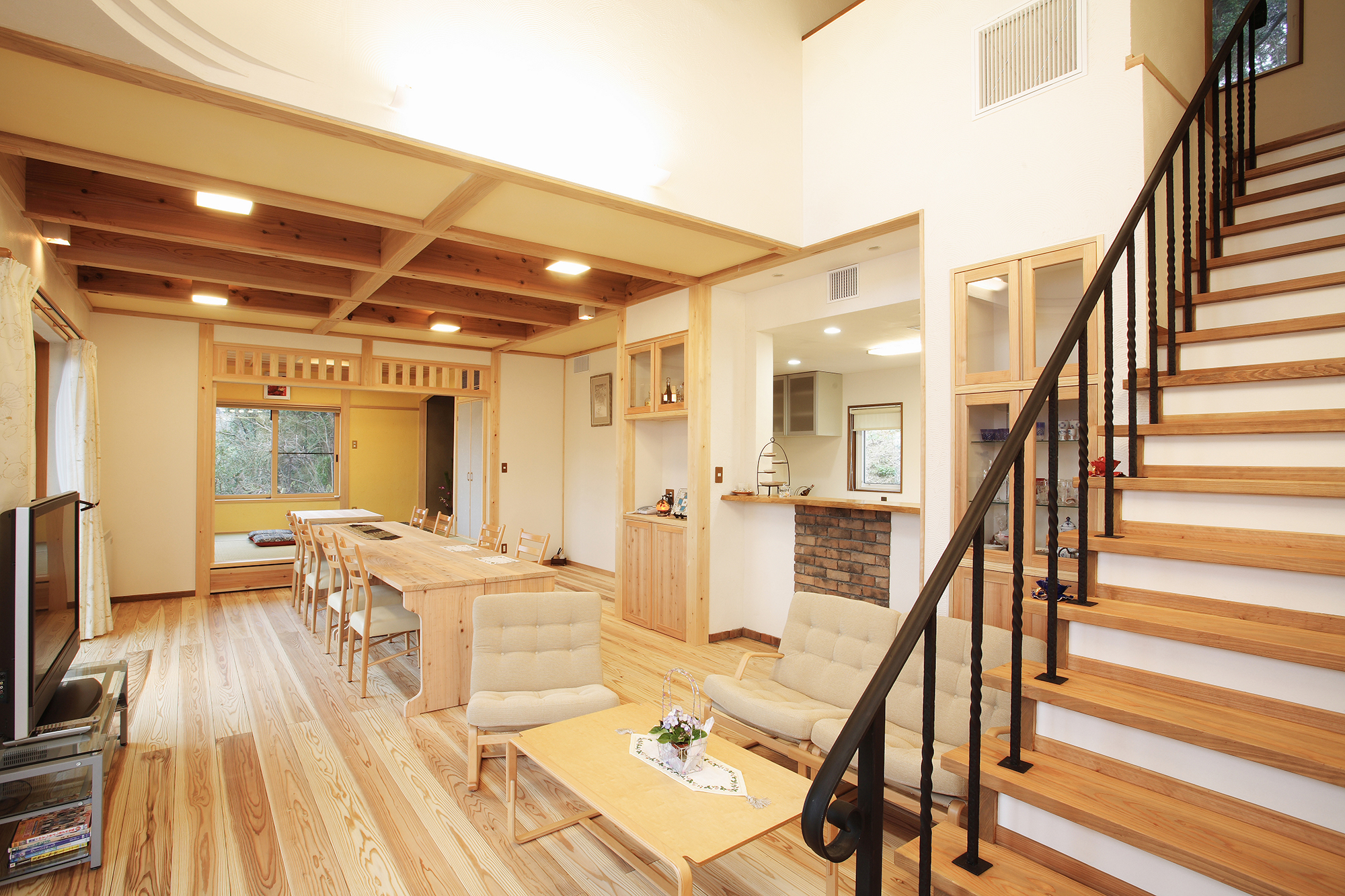 保温性に優れ、一年中素足で過ごせる「うづくり」の杉の床。さらに化学物質を吸着・分解する「天然の空気清浄器」幻の漆喰の塗り壁が特徴です。