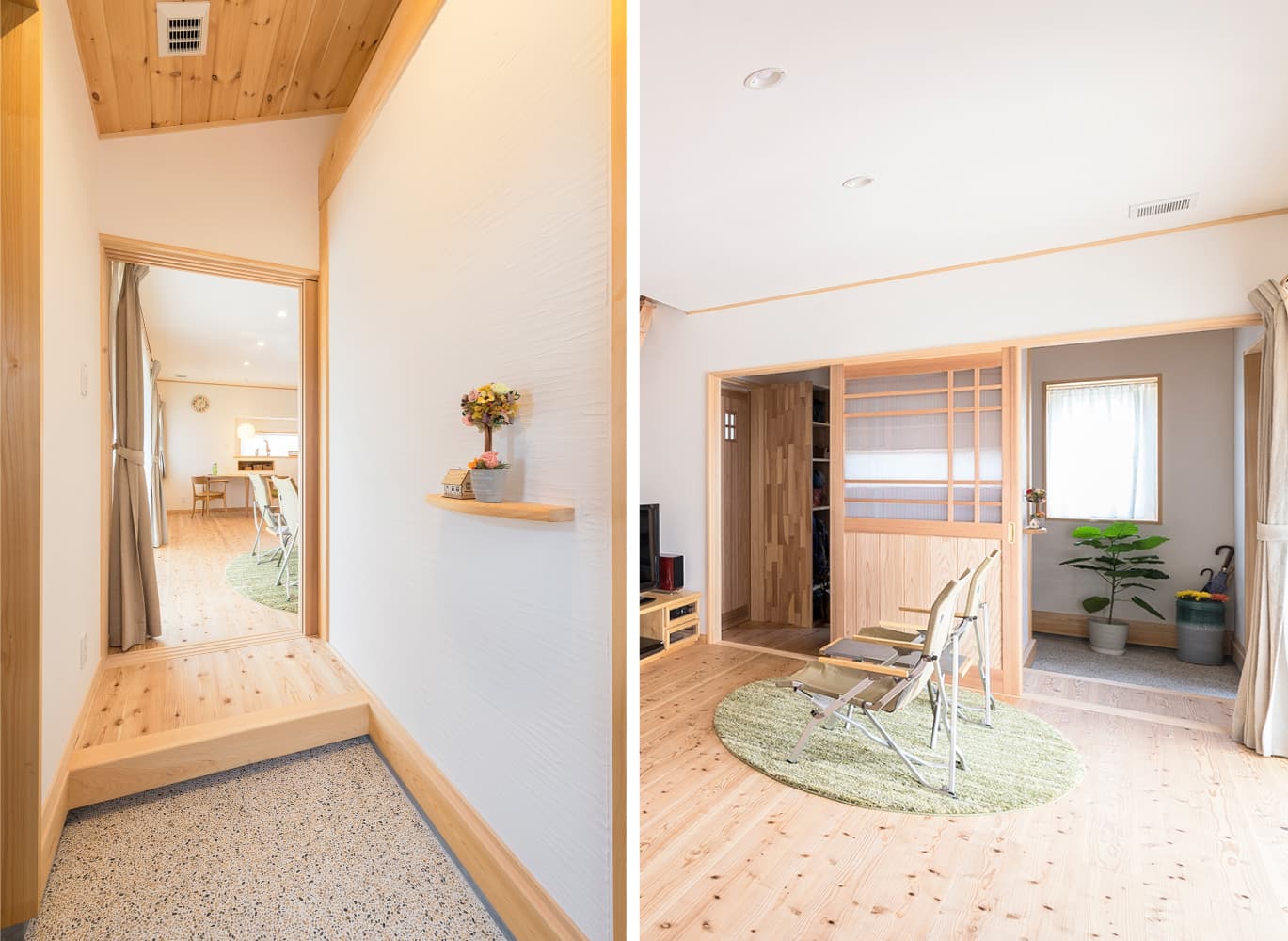 玄関からリビングまですぐに繋がる動線は、買い物の荷物を持ったままでも、アウトドア用の荷物の出し入れも、スムーズに行えるよう「引き戸タイプ」に。