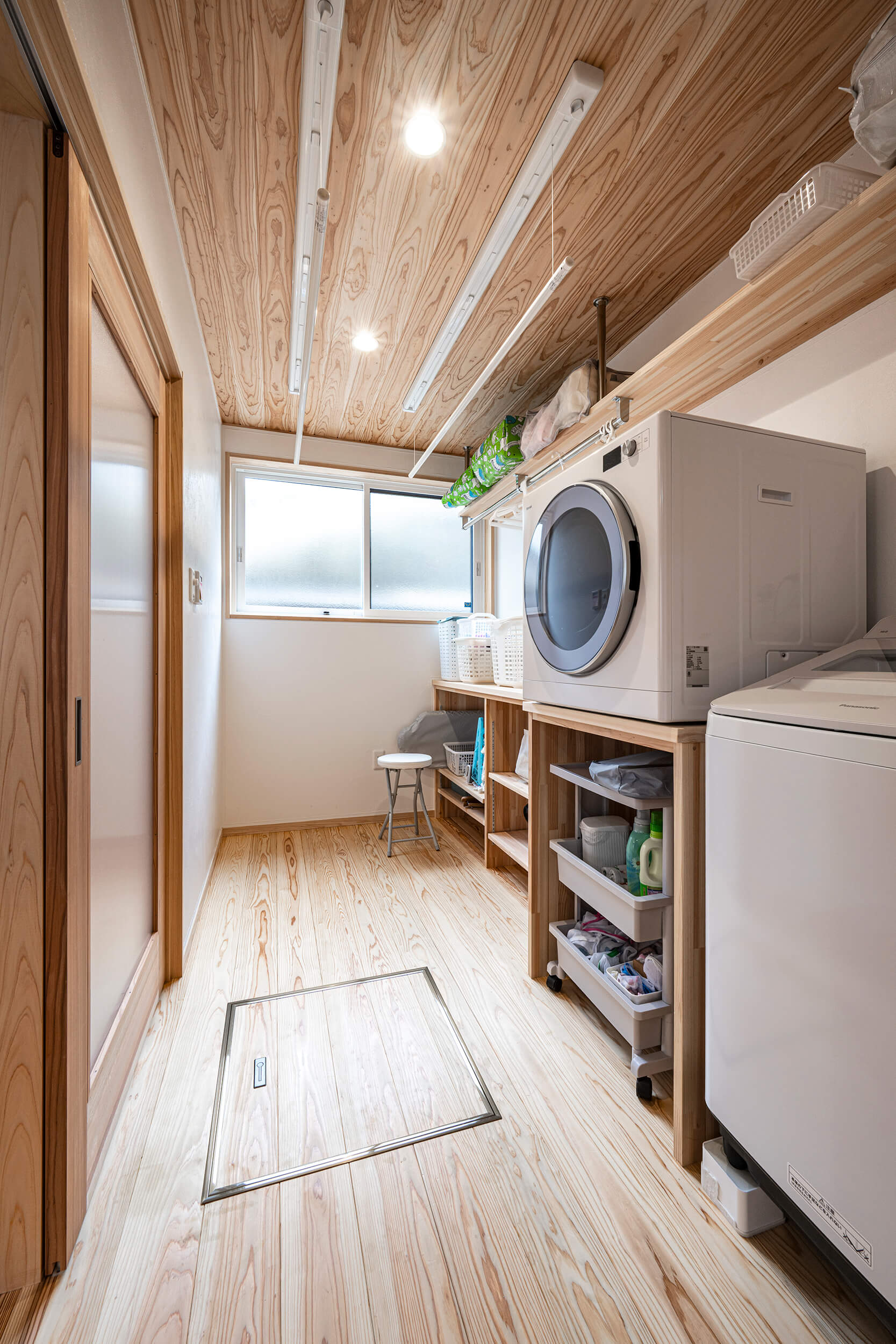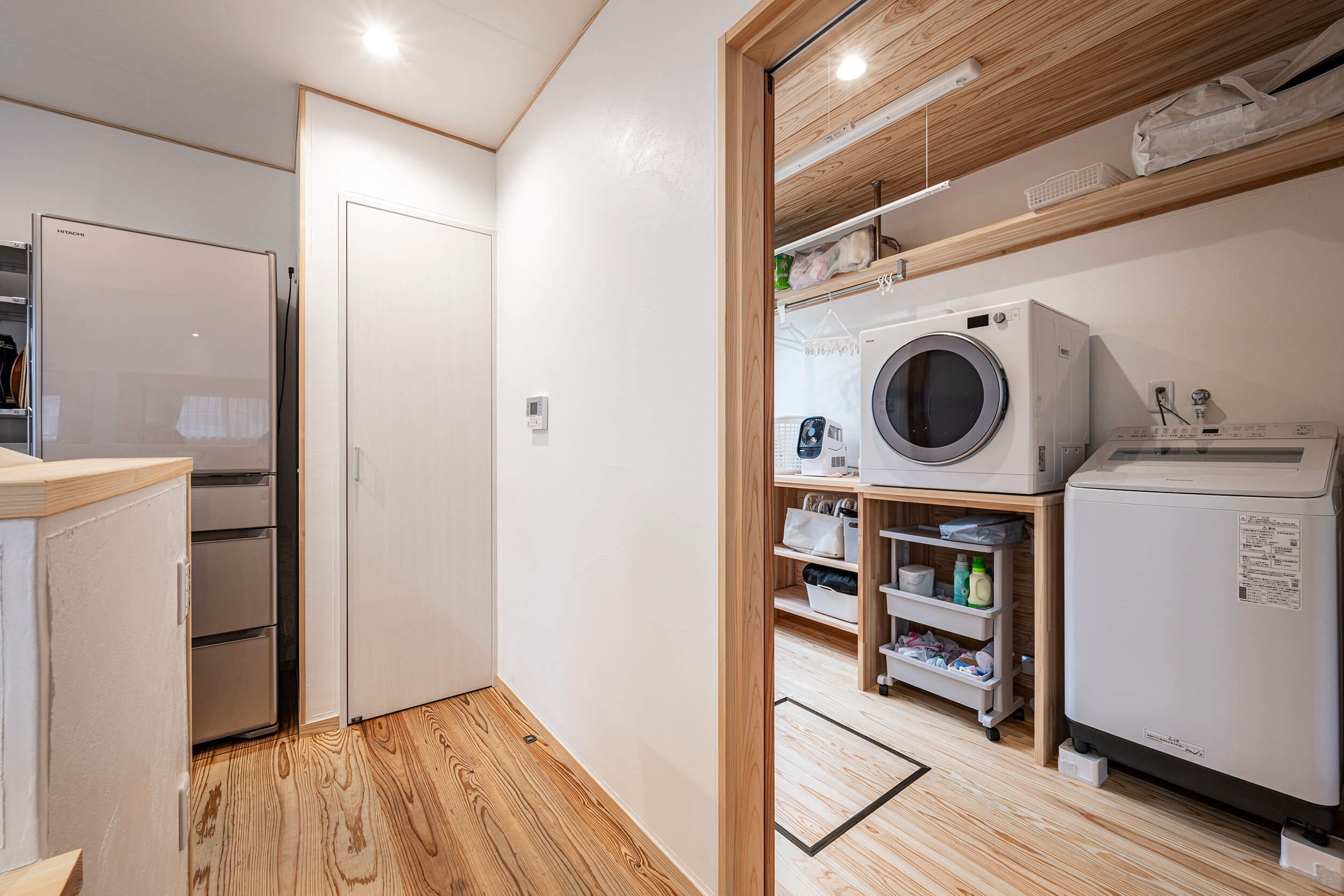 キッチンのすぐ横にはランドリールームを配置し、「洗う・干す・しまう」の流れを短い動線で完結。
