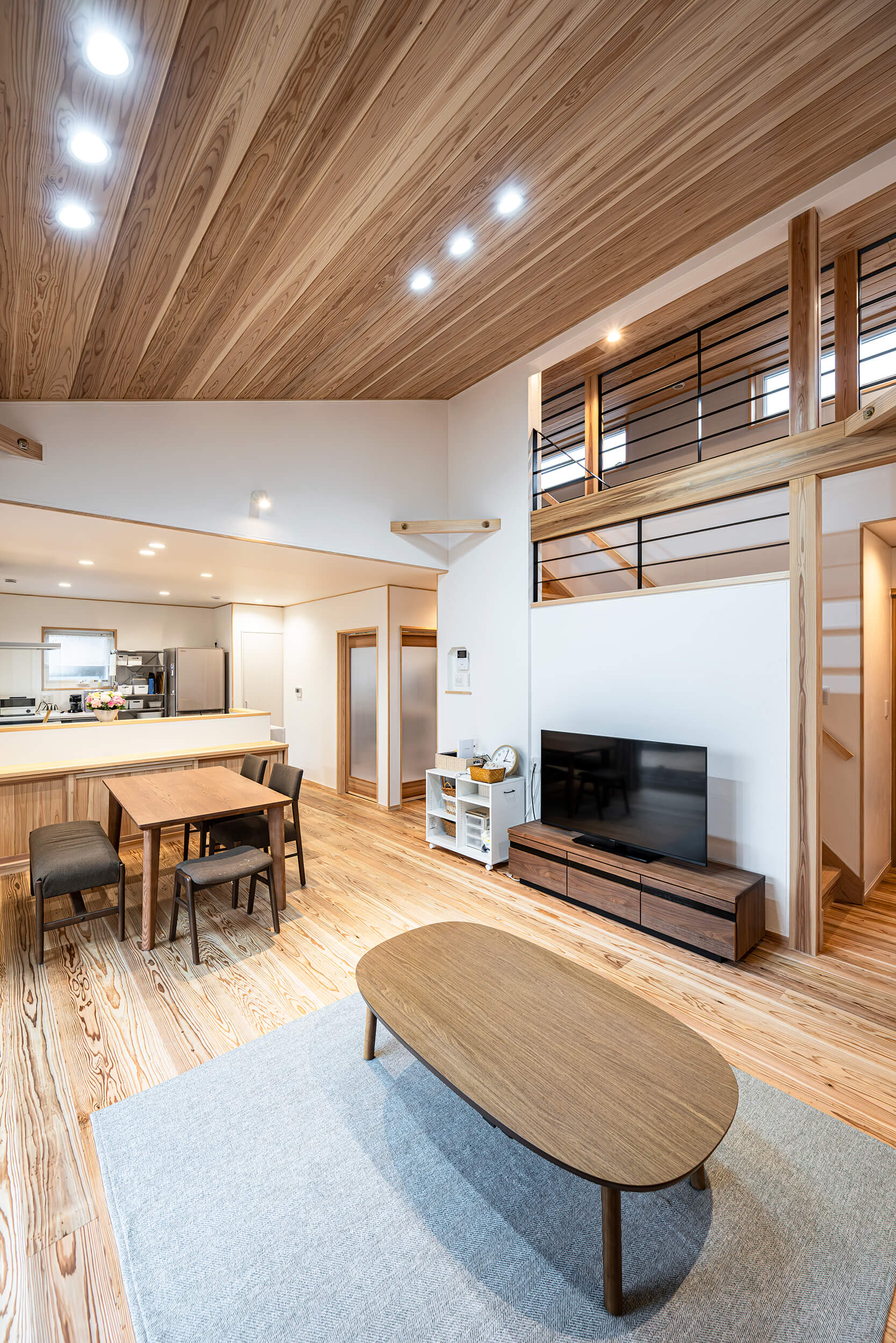 勾配天井と吹き抜けが心地よい、開放感あふれるリビング・ダイニングが特徴のお住まいです。