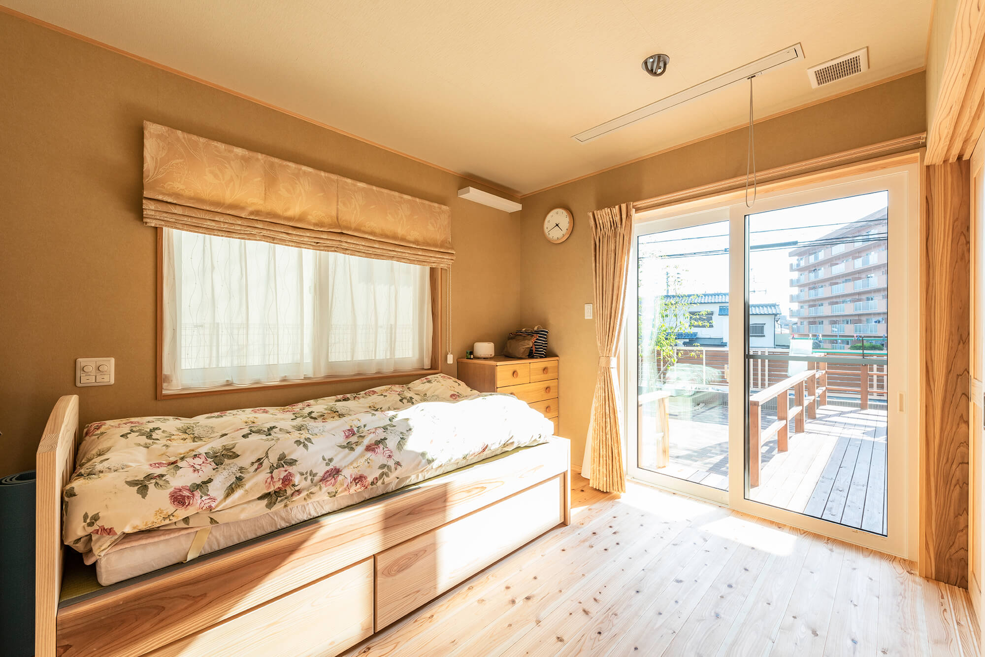 寝室は室内と外が自然につながる設計で、植栽や木製の目隠しがプライバシーを守ります。