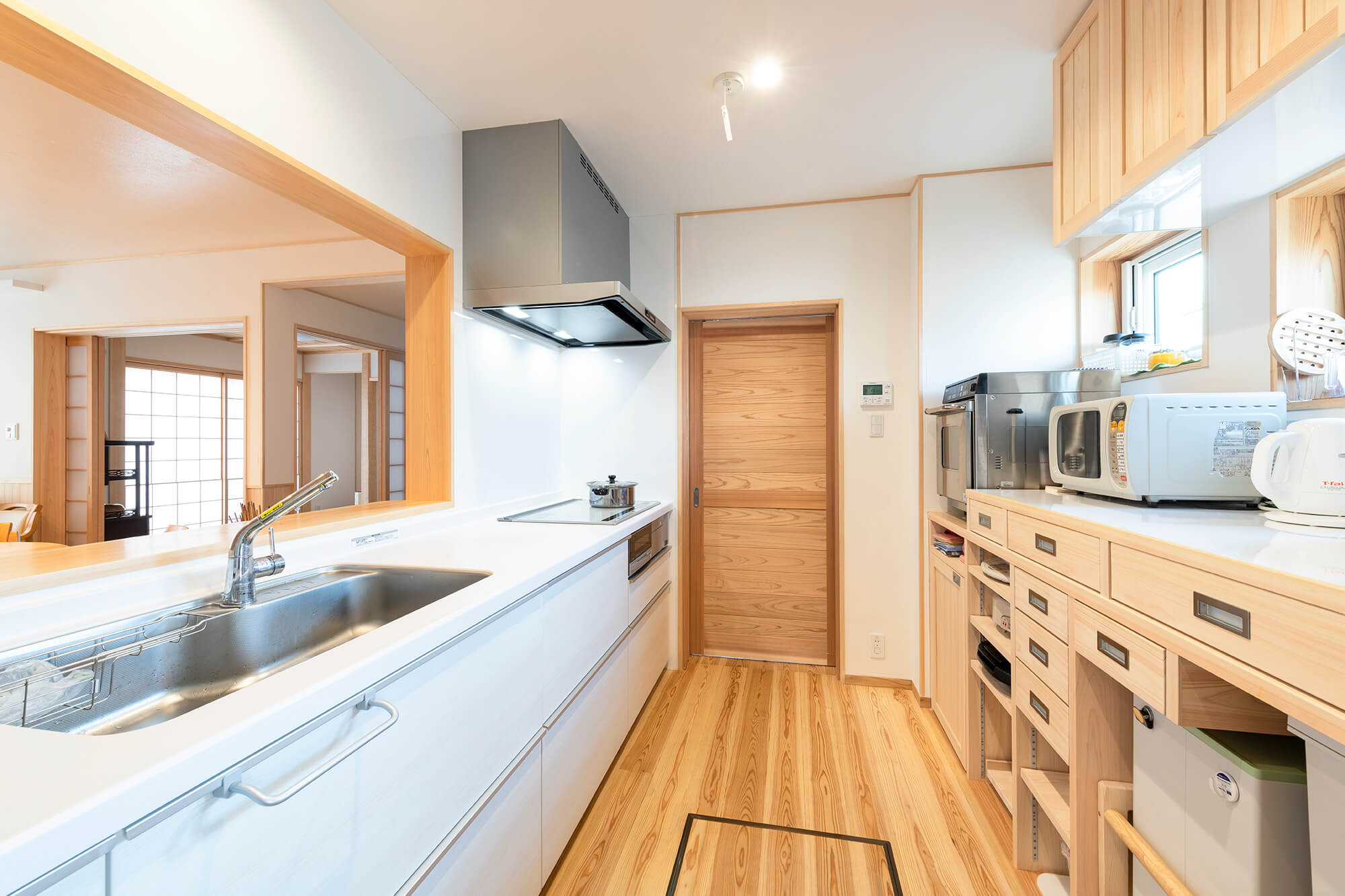 無垢材と漆喰を組み合わせた腰壁が、空間にやわらかな表情を添える心地よい住まい。