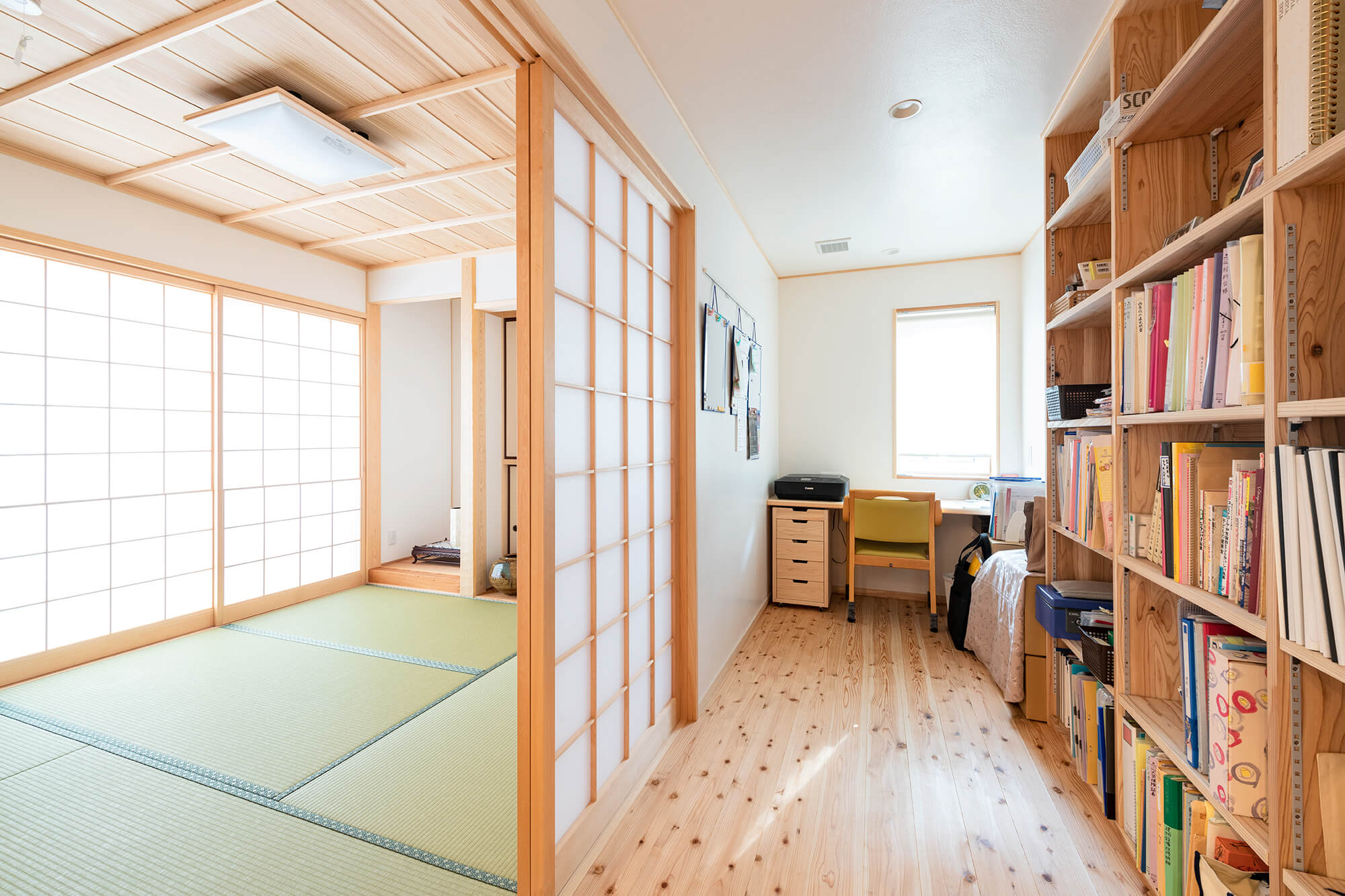 リビング横にはシームレスにつながる畳スペースをつくり、短い廊下の先には本棚も配置。