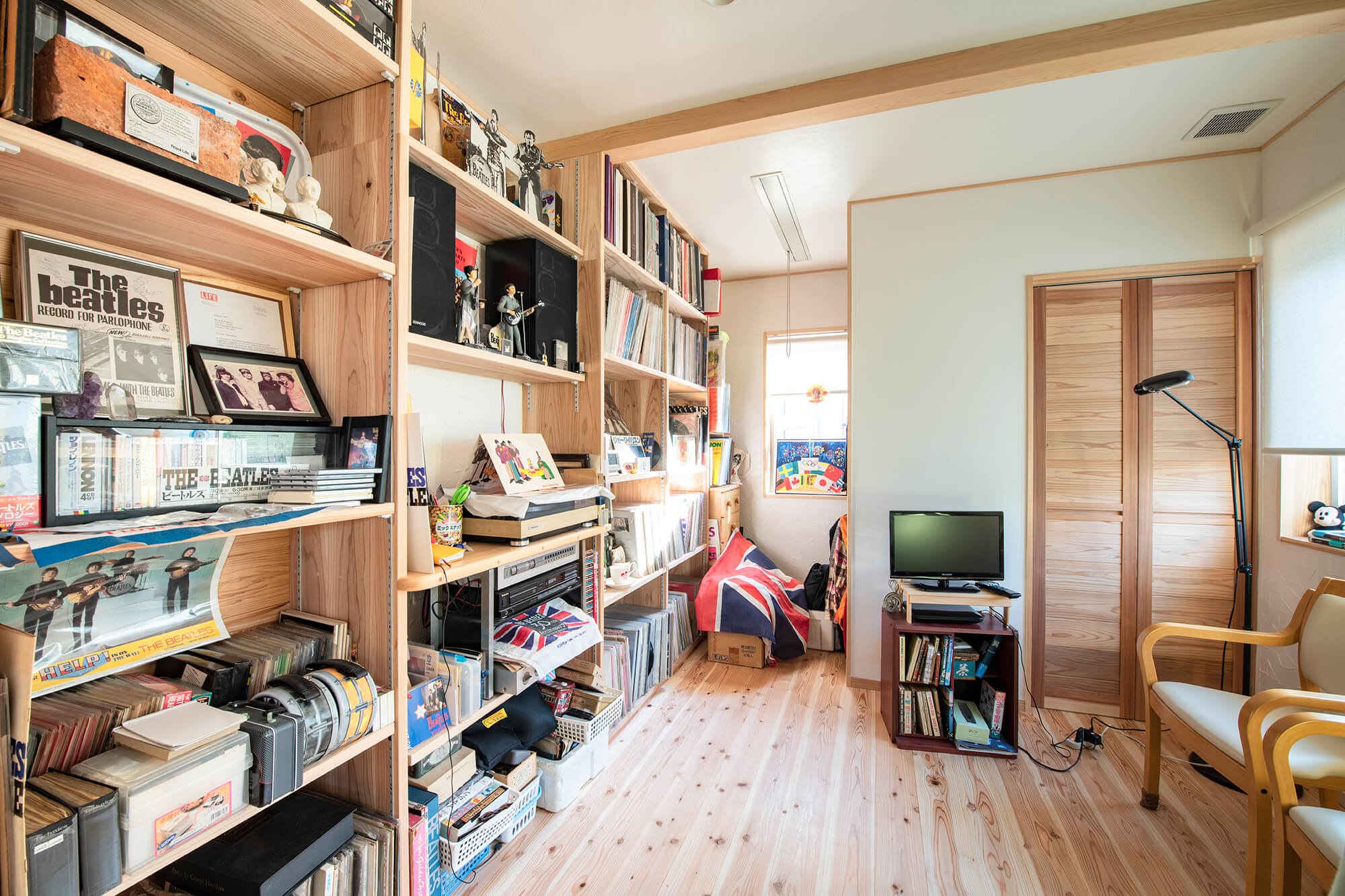 音楽を楽しむ一室には、ビートルズ愛が伝わるコレクションがずらり。