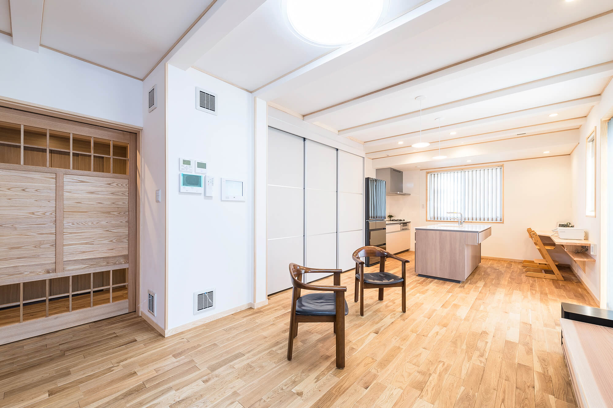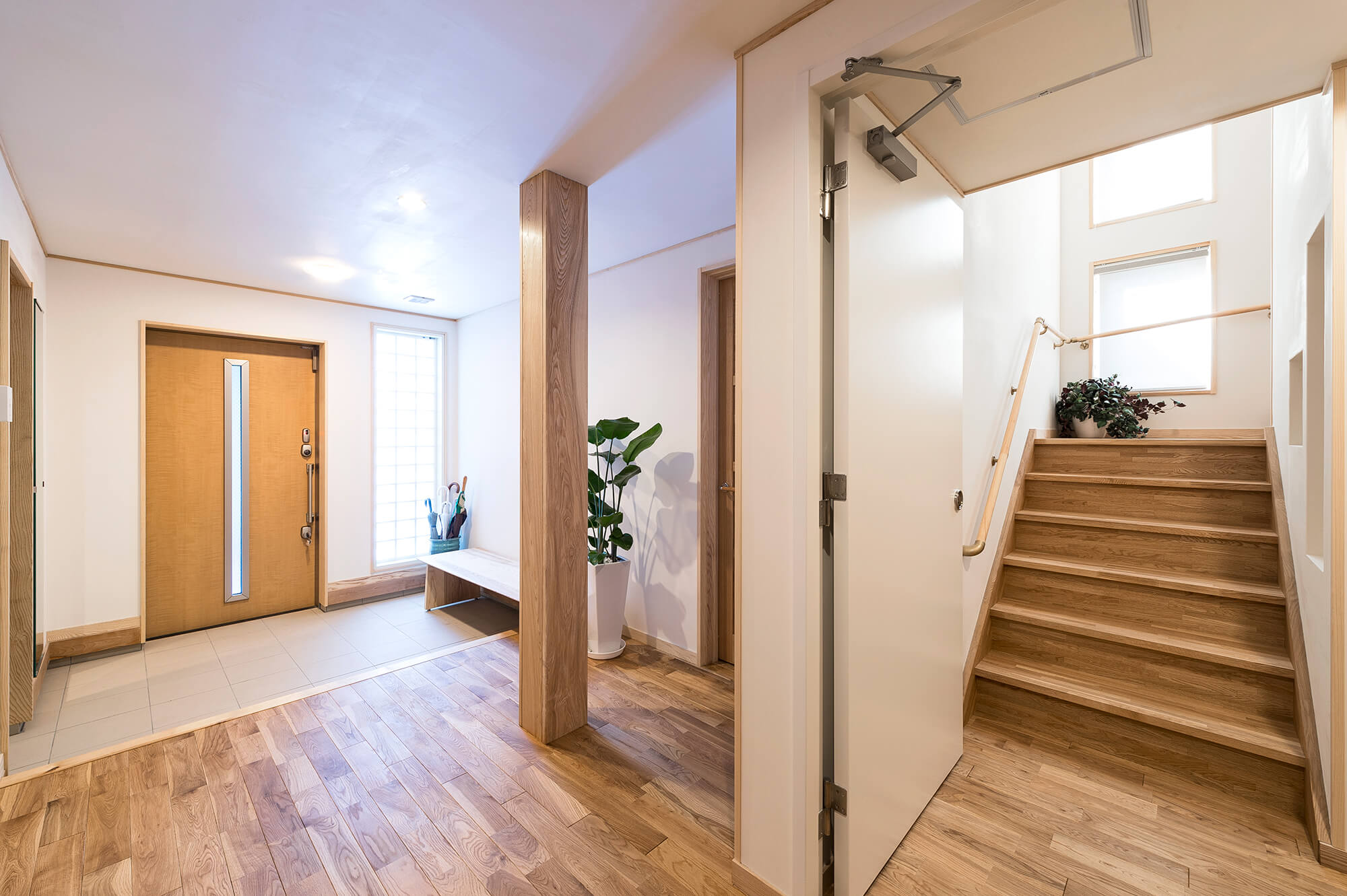 玄関のスライドドアや、段差をなくした室内設計は、お子様の安全はもちろん、将来の暮らしまで見据えた優しさの形。