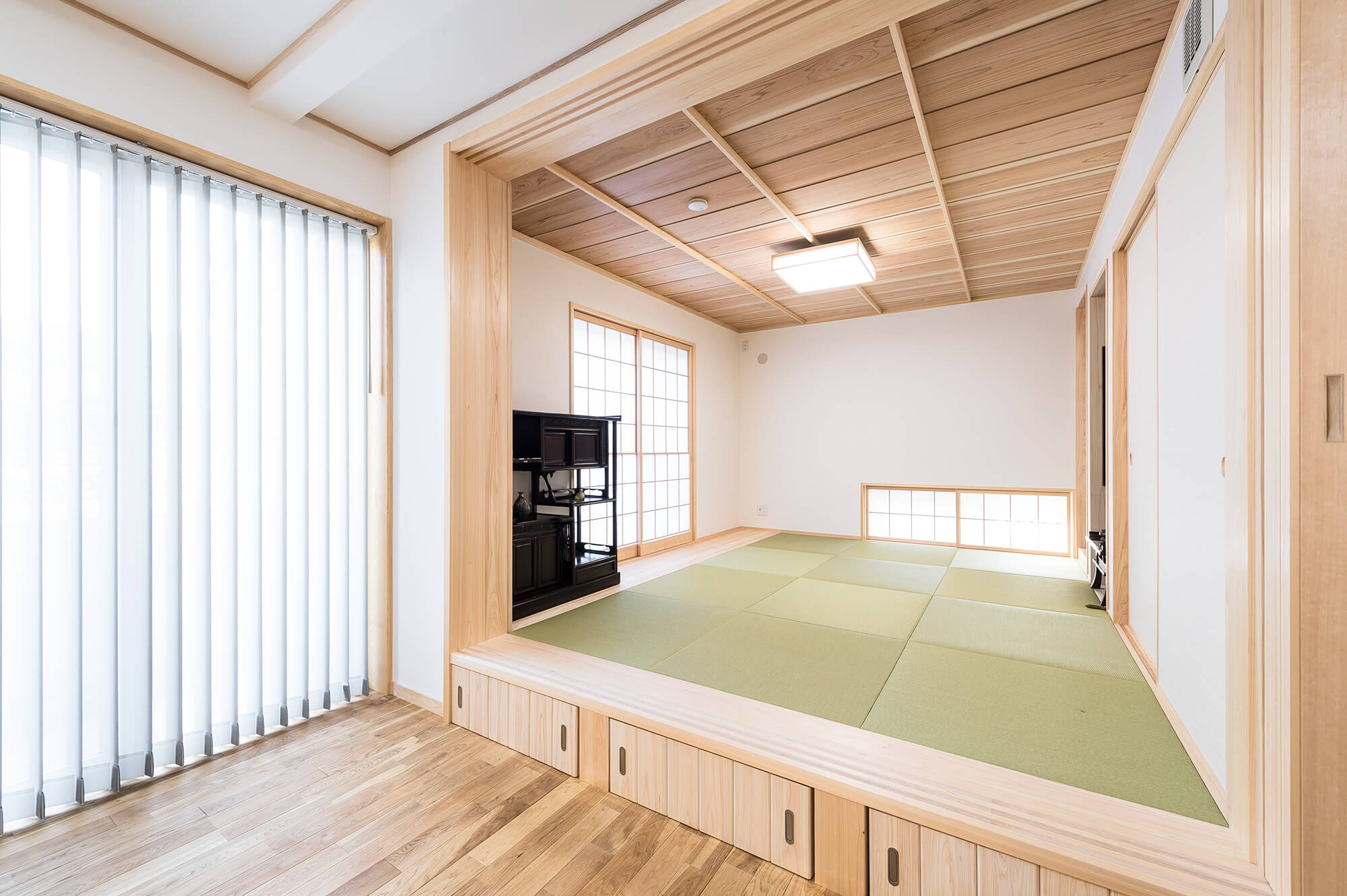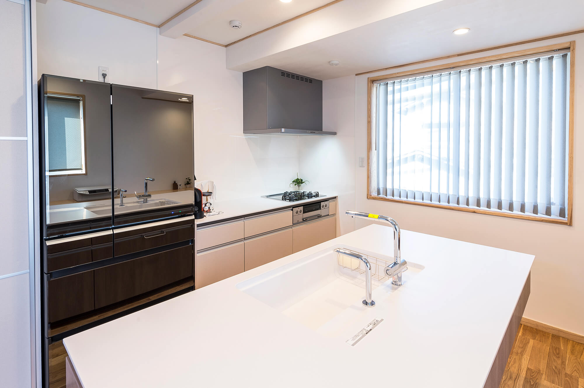作業効率に優れたⅡ型キッチンを中心に、横長のワークスペースや、段差を活かした和室収納など、「限られた空間を賢く使う」アイデアが随所に散りばめられています。